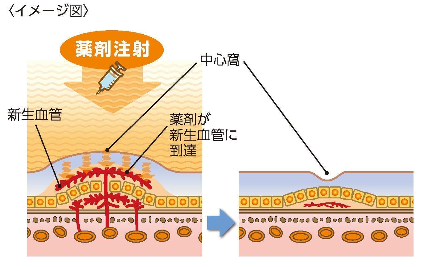 これはVEGFの働きを抑える薬剤を眼の中に注射することで、病気の進行を抑制する治療法です。この治療は通院で行えます。