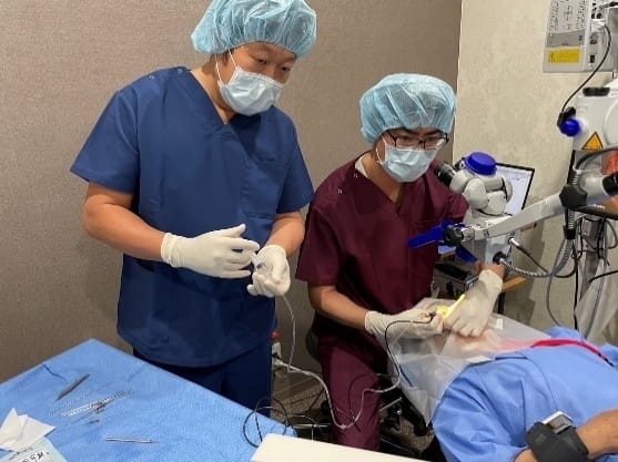 国内開発の極小内視鏡を涙道から鼻腔に通し、先端から放水して涙道を洗浄します。その後、きれいになった涙道に専用の涙管チューブを挿入し、涙道の詰まりを取ります。