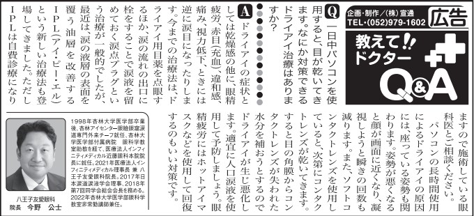 朝日新聞広告の「教えてドクター!Q&A」に理事長のコラムが掲載されました。ドライアイ治療について